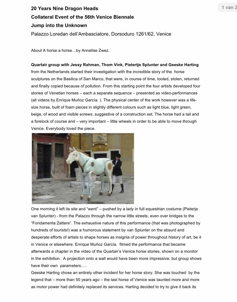 Horse stories, Quartair groep (Pietertje van Splunter, Thom Vink, Jessy Rahman, Geeske Harting), onderdeel van 20 Years Nine Dragon Heads, Collateral Event of the 56th Venice Biennale, Jump into the Unknown, 2015. Uitgangspunt waren de paarden van de San Marco van Venetië. Eerst moest er een paard gemaakt worden, levensgroot en min of meer mobiel. Ieder van ons bedacht zijn of haar verhaal bij het paard: “The horse stories”. Zo’n twee verhalen per persoon eigenlijk, het paard “reisde” van Den Haag naar Venetië en zowel in Nederland als in Venetië zou het paard avonturen beleven. Ik bedacht twee verhalen: “Hippocampus”, over het mythische paard met de vissenstaart, in dit geval is de vissenstaart veranderd in plastic afval. Met hulp van de overige Quartairgroepers is dit tot stand gebracht op het strand van Hoek van Holland, 2014. Mijn andere verhaal, “Tribute to the last Horse of Venice”, speelde zich af in Venetië.