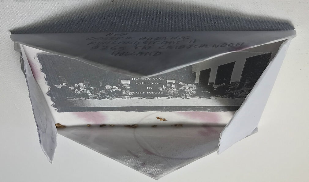 The Last Supper, mixed media: papier, broodkruimels, wijn, servetten, 2020. Deelname aan het gelijknamige mailart project van de Cloudknitter, België, i.s.m. Quartair, Den Haag